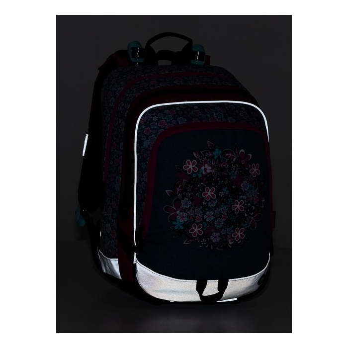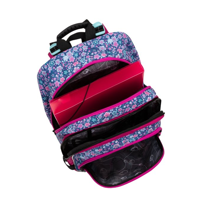 Dievčenský školský batoh ALFA, má tri komory. Hlavná komora je spracovaná tak, aby sa do nej pohodlne vošli školské dosky (rozmery dosiek:32 x 22,2 x 5 cm), zošity veľkosti A4 alebo ťažšie učebnice. Vo vnútornej časti tejto hlavnej komory je v prešitom látkovom vrecku fixovaný k chrbátu batohu ľahučký, ale vysoko účinný hliníkový rám, ktorý je ergonomicky tvarovaný. Vnútorný hliníkový rám efektívne rovnomerne rozkladá váhu naplneného batohu a nezaťažuje chrbát dieťaťa a tím podporuje zdravý rast chrbtice a správny vývoj chrbátu školáka.