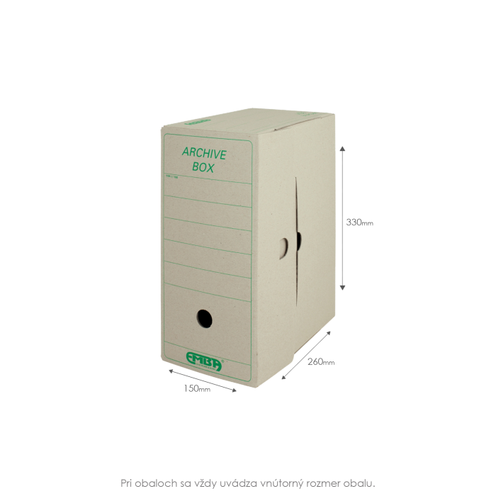 Ekologický výrobok. Box z recyklovanej špeciálne impregnovanej lepenky odolnej voči atmosfeérickej vlhkosti na dlhodobé uloženie záznamov. Tri varianty postavenia, kvalitná sieťotlač. Vhodný v kombinácii so skupinovým boxom. Väčšie balenie 25 ks.