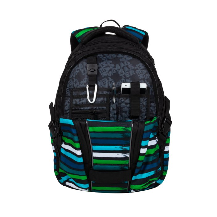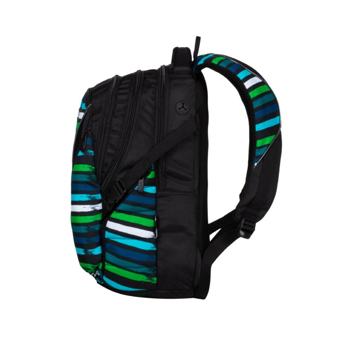 Špecifikácia študentského batohu BAG: Trojkomorový študentský batoh Anatomicky tvarovaný mäkko vystužený chrbát, Vystužené ramenné popruhy - na batoh je možné dokúpiť flexibilnú hrudnú pásku Hlavná komora a prostredná komora je vhodná na formát A4 (učebnice, školské dosky). Vystužené odolné dno, Reflexné prvky vpredu a vzadu Vystužené vrecko na notebook 15" 2 postranné vrecká na zips s vnútornou sieťkou, vhodné na fľašu Bočné kompresné popruhy k redukcii veľkosti batohu - je ich možné využiť aj k fixácii vyššej fľaše. Ďalej tiež ponúkame: Detailný popis BAG: Hlavná komora je veľmi priestorná, pohodlne sa do nej vojdu napr. školské dosky aj učebnice formátu A4. Vo vnútri komory je veľké vrecko na gumu a vystužené vrecko na MP3 prehrávač alebo power banku (rozmery vrecka: 8,5 x 10 x 2cm), z hlavnej komory je vývod na kábel alebo sluchátka. Vo vnútri druhej (prostrednej) komory je vystužené vrecko na notebook, v hornej časti fixované popruhom na suchý zips, k zaistenie a upevnenie notebooku (rozmery vrecka: 28 x 27 x 6 cm). V prednej komore je prehľadný organizér, zo sieťovaným vreckom na zips a vreckom na mobil, mince alebo iné drobnosti. V hornej časti tejto komory je odnímateľný klip na kľúče s karabínou. V prednej časti batohu sú tri menšie vrecká na zips. Malé, mäkké vrecko ochráni vaše okuliare pred poškriabaním. Predné vertikálne vrecká sú vhodné na fľašu o objeme cca 0,5l alebo iné drobnosti. Dve bočné vrecká zo sieťkou a na zips sú konštruované na klasickú fľašu na pitie. Vojde sa sem aj 1,5l PET fľaša, ktorú je potrebné zafixovať bočnými kompresnými popruhmi, ktoré slúžia k stiahnutiu hĺbky batohu. Ramenné popruhy sú anatomicky tvarované a mäkko vystužené. Batoh je možné fixovať na ramenách pomocou voliteľného príslušenstva flexibilnej hrudnej pásky. Materiály použité na výrobu tohoto študentského batohu splňujú, z hľadiska nezávadnosti, normy EU. Dno batohu je vystužené a prešité. Batoh je vhodný pre chlapcov aj dievčatá. Vzhľadom k tomu, že sa jednotlivé potlačené časti batohu strihajú z role látky, môže byť každý batoh originál, tzn. rozloženie farebných plôch sa môže líšiť od fotografie.