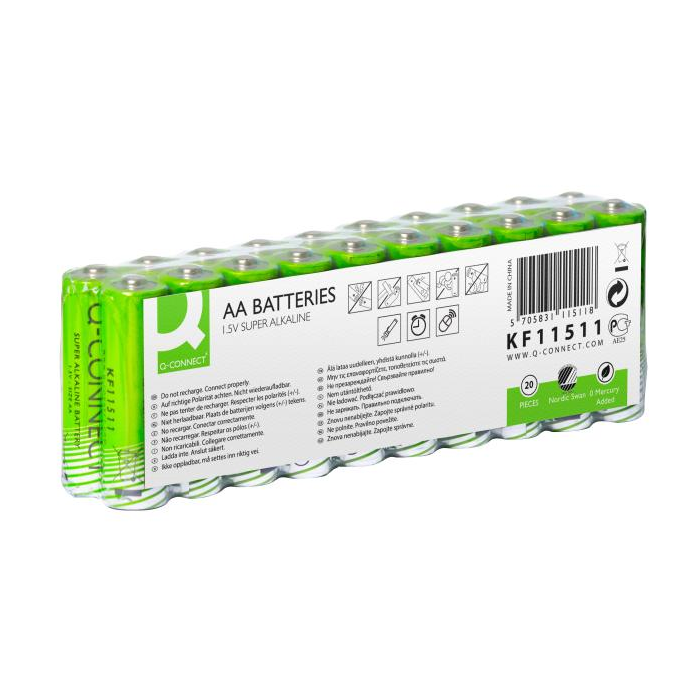 Univerzálna vysokovýkonná alkalická 1,5 V batéria Q-Connect. Neobsahuje pridanú ortuť. Veľkosť AA. Balenie 20 ks. Má certifikát ekoznačky Nordic Swan.
