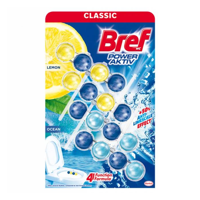 Bref Power Aktív WC blok s vôňou citrónu & oceánu a o plus 50% vyšším účinkom proti vodnému kameňu. Hľadáte jednoduchší spôsob, ako udržať vašu toaletu čistú a sviežu? Bref WC blok je jednoduchým a pohodlným spôsobom, ktorý zaisťuje čistotu a sviežosť vo vašej toalete od prvého do posledného spláchnutia.