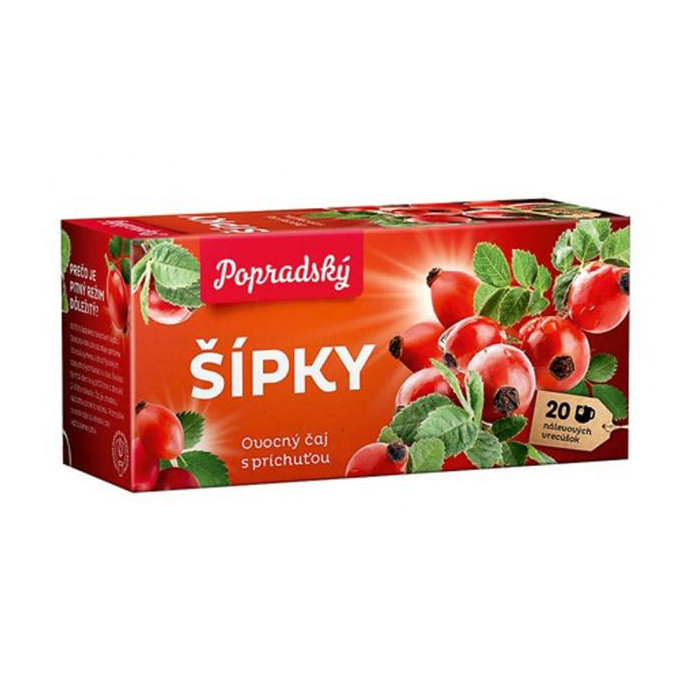 Ovocný čaj s príchuťou Šípky. Porciovaný v nálevových vreckách.