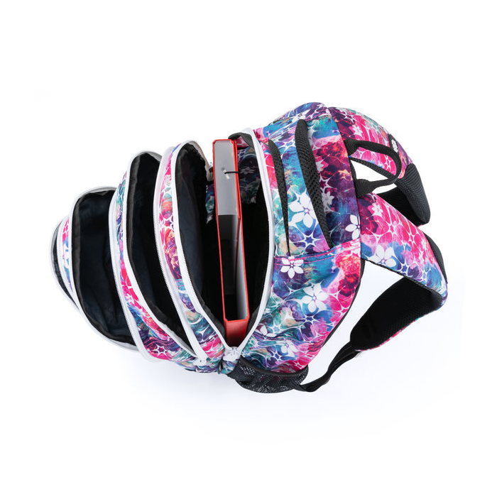 Hlavná komora je veľmi priestorná, pohodlne sa do nej vojdu napr. školské dosky aj učebnice formátu A4. Vo vnútri komory veľké vrecko na gumu. Druhá (prostredná) komora je vhodná na formát A4. V prednej komore je prehľadný organizér, zo sieťovaným vreckom na zips. Z tejto komory je vývod na kábel alebo sluchátka. V prednej časti batohu je vrecko na zips, jeho vnútorná hĺbka je 23 cm! (kopíruje veľkosť prednej komory). Dve bočné sieťované vrecká, vhodné na fľašu. Dno batohu je z vonkajšej strany z látky 600 D polyester, vnútorná časť je vystužená podšívkou. Ramenné popruhy sú anatomicky tvarované a mäkko vystužené. Batoh je možné fixovať na ramenách pomocou voliteľného príslušenstva flexibilnej hrudnej pásky, ktorá nieje súčasťou ale môžete si ju u nás k batohu dokúpiť. Materiály splňujú, z hľadiska nezávadnosti, normy EU. Dno batohu je vystužené a prešité.