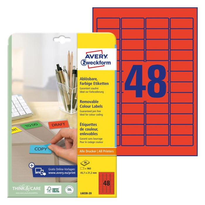 Odnímateľné samolepiace etikety STICK & LIFT odlepiteľné a znovu prelepiteľné (na bežnom povrchu až 5×) bez toho, aby zanechali stopy lepidla. Sú vhodné pre všetky druhy tlačiarní a kopíriek. Využiteľné najmä na každodenné pracovné činnosti, ako napr. vytváranie popisov, cenoviek, označovanie výrobkov, majetku a pod. Farba červená. Etikety na hárku 48 ks. Balenie 20 hárkov.