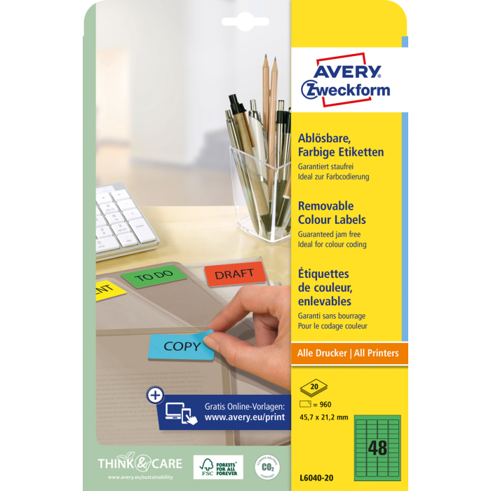 Odnímateľné samolepiace etikety STICK & LIFT odlepiteľné a znovu prelepiteľné (na bežnom povrchu až 5×) bez toho, aby zanechali stopy lepidla. Sú vhodné pre všetky druhy tlačiarní a kopíriek. Využiteľné najmä na každodenné pracovné činnosti, ako napr. vytváranie popisov, cenoviek, označovanie výrobkov, majetku a pod. Farba zelená. Etikety na hárku 48 ks. Balenie 20 hárkov.