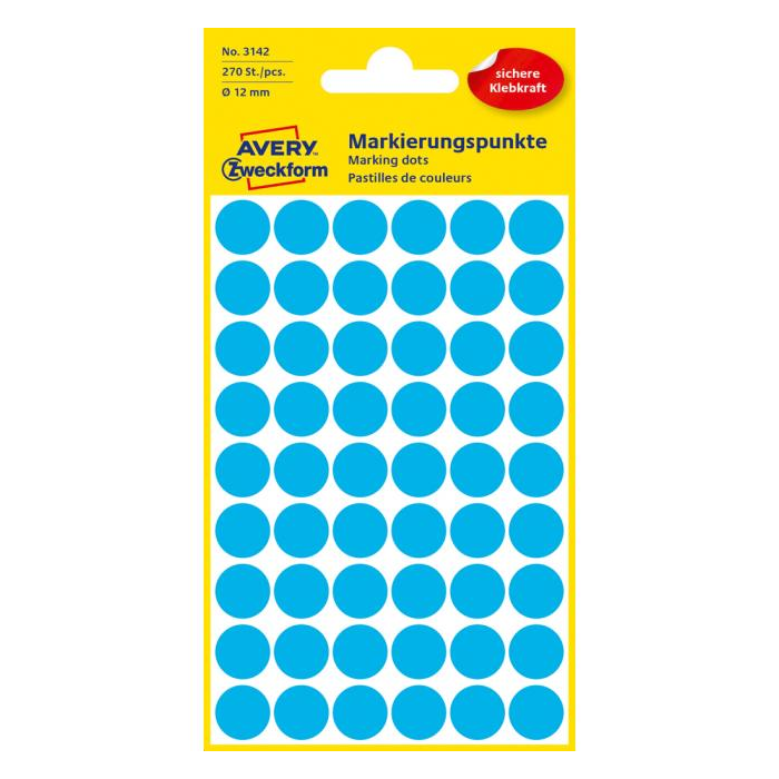 Kruhové etikety na ručný popis. Priemer 12 mm, v balení 270 etikiet. Farba modrá.