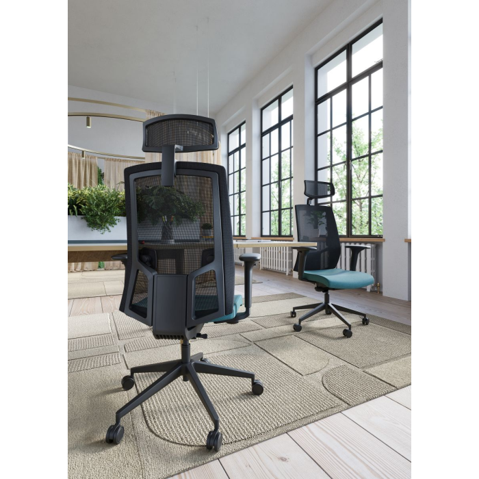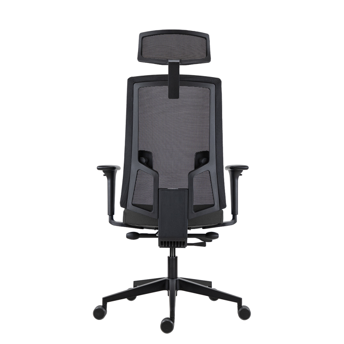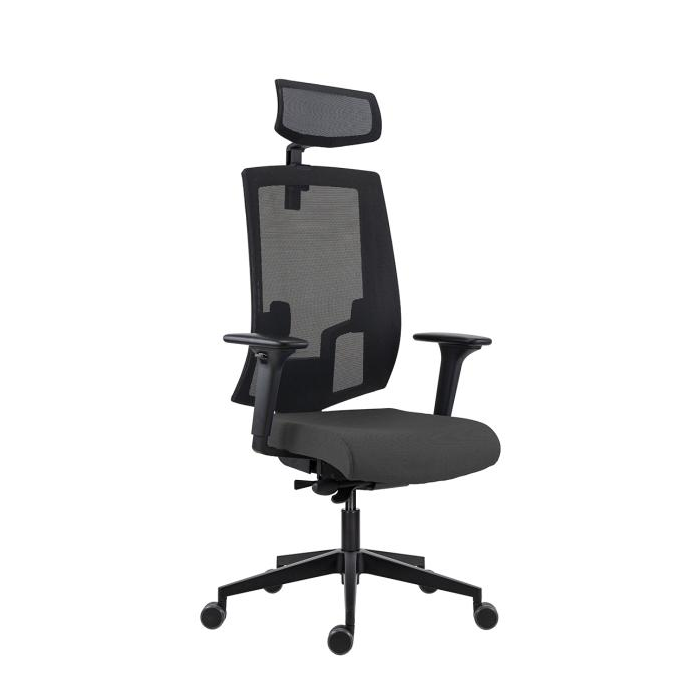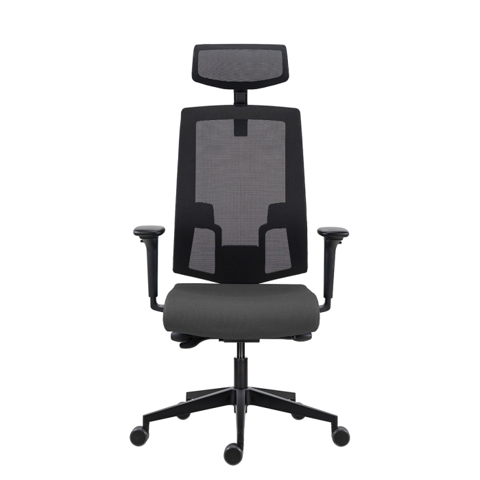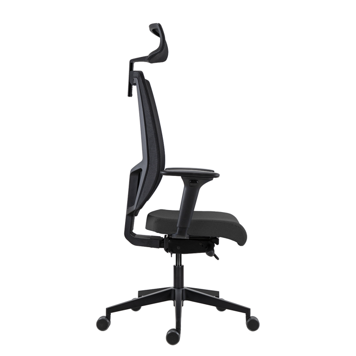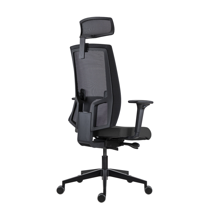 Kancelárska stolička s unikátnym systémom bedrovej opory, čalúneným sedákom, sieťovinou na operadle a podhlavníku.
