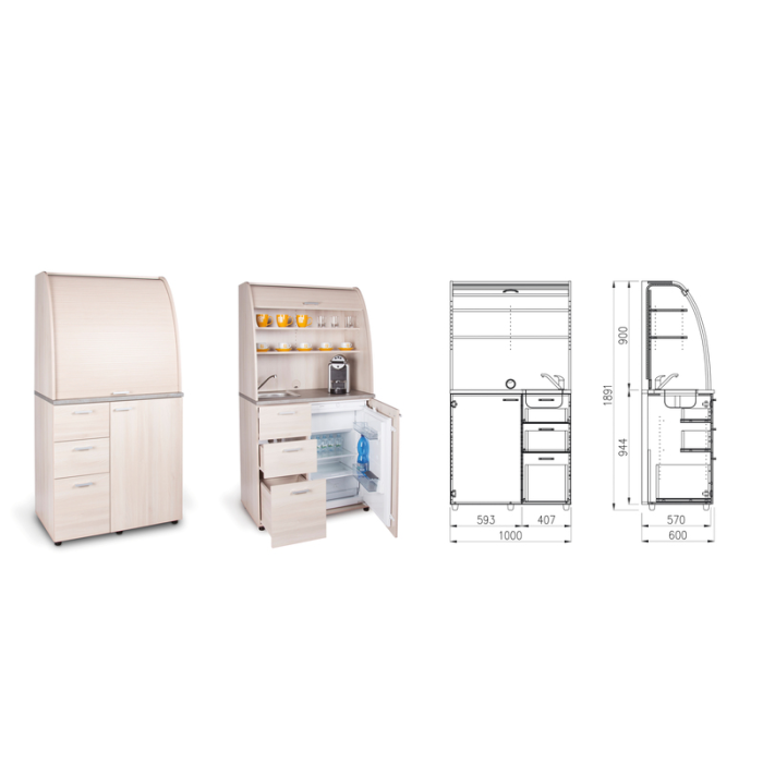 • Dve police vo vrchnej časti kuchynky poskytujú dostatočnú kapacitu na poháre, šálky a taniere. Na pracovnú dosku môžete umiestniť napr. kávovar a káblovou priechodkou v zadnej časti vyvediete kábel z priestoru kuchynky.