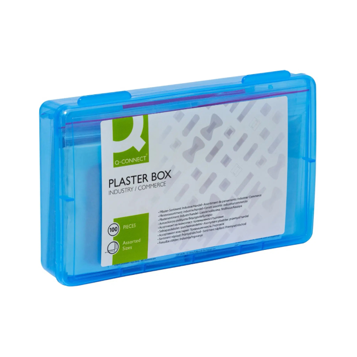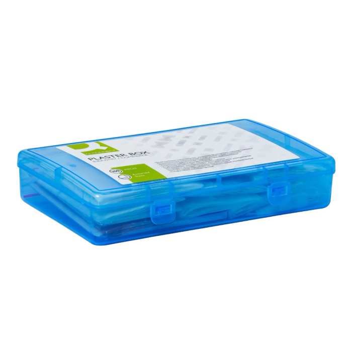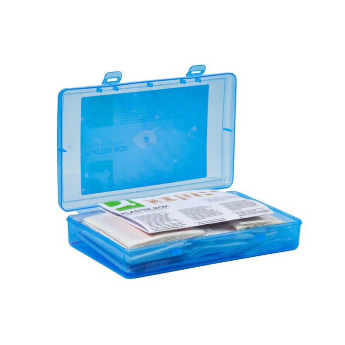 Ideálne na drobné poranenia v reštauráciách a obchodných prevádzkach. Praktická, uzatvárateľná plastová krabička. Obsah: - 10 bandáží na kĺby prstov (7,5 x 4 cm) z textilnej elastickej látky. - 10 obväzov na končeky prstov (5 x 4 cm) z textilnej elastickej látky. - 10 obväzov na prsty (12 x 2 cm) z textilnej, elastickej látky. - 15 malých sadrových pásikov (1,9 x 7,2 cm) z textilnej elastickej látky. - 15 sadrových pásikov (2,5 x 7,2 cm) z textilnej, elastickej tkaniny. - 10 vodotesných oválnych náplastí (5,0 x 7,2 cm) transparentných. - 10 oválnych náplastí (5 x 7 cm) z textilnej, elastickej tkaniny. - 10 obväzov na rany (10 x 6 cm) z textilu, štandard. - 10 citlivých obväzov na rany (10 x 6 cm), biele fleece, hypoalergénne. Rozmer (ŠxVxH): 20,8 x 4,4 x 13,2 cm. Hmotnosť: 226 g. Farba: modro-transparentná