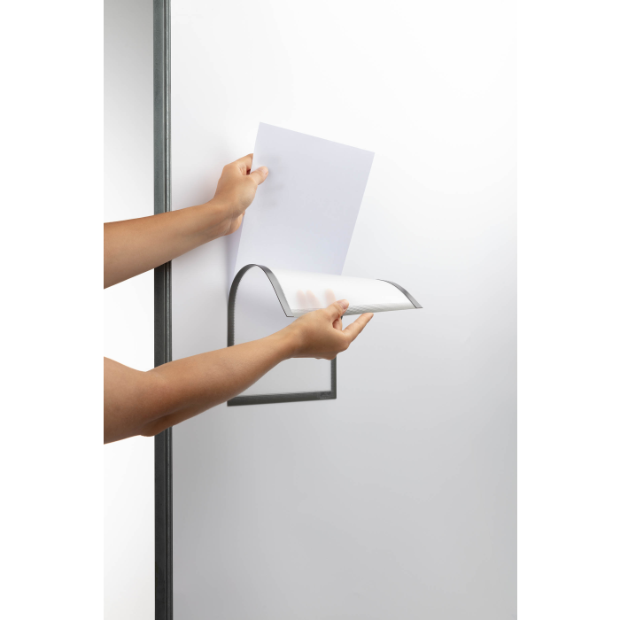 Držiak na dokumenty vo formáte A4 na pripevnenie pomocou troch magnetických pásikov na kovový podklad. Farba sivá.