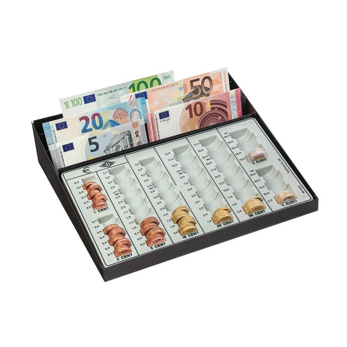 Samostatná mincová priehradka v oceľovom ráme. Rozmerovo vhodná do bežnej stolovej zásuvky. Priestor s tromi priehradkami na bankovky, poukážky alebo stravné lístky vo vrchnej časti. Maximálna kapacita 125,75 Euro.