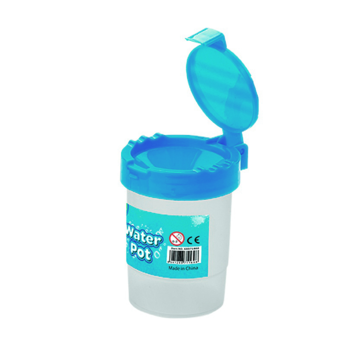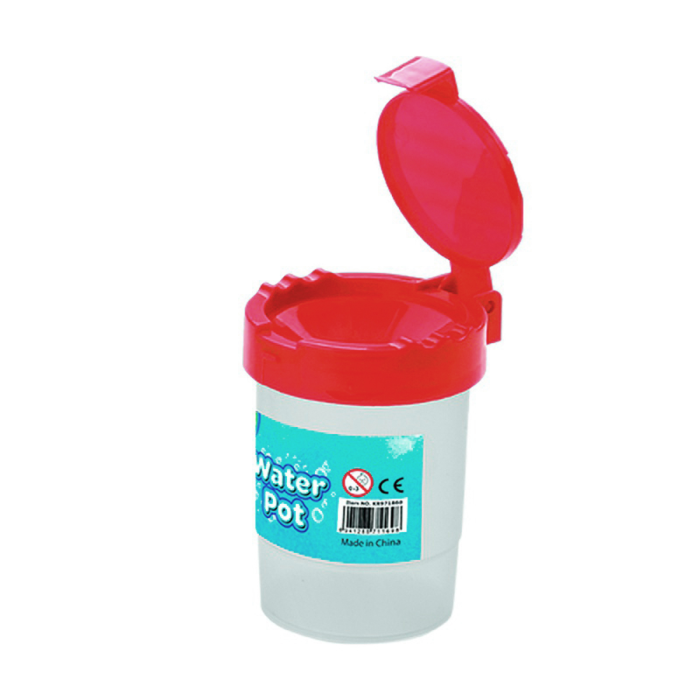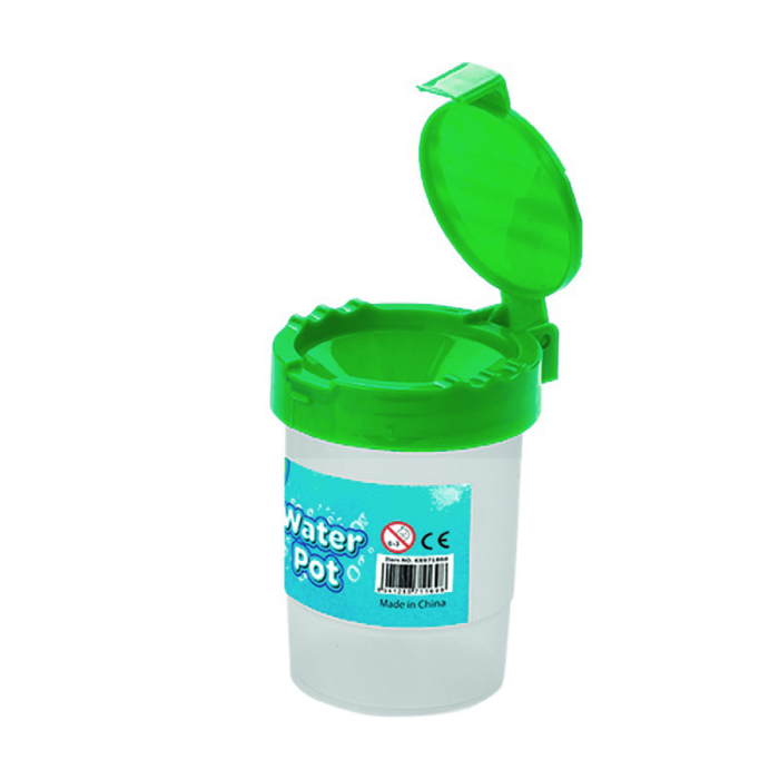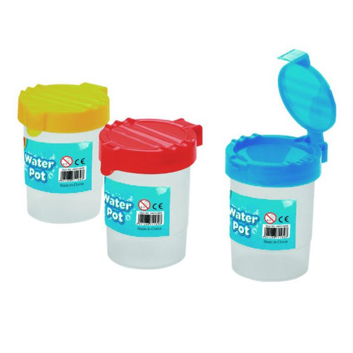 Praktický plastový pohár na vodu so zátkou proti rozliatiu a viečkom, určený školám a deťom, ktoré používajú doma vodou riediteľné farby. Objem: 150 ml. Farba: mix farieb.