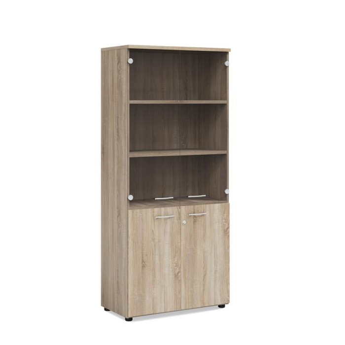 Policová skriňa BASIC, 4 police, kombinovaná so sklom, so zámkom na dolných dvierkach, 80x40x182,1cm, dub Sonoma