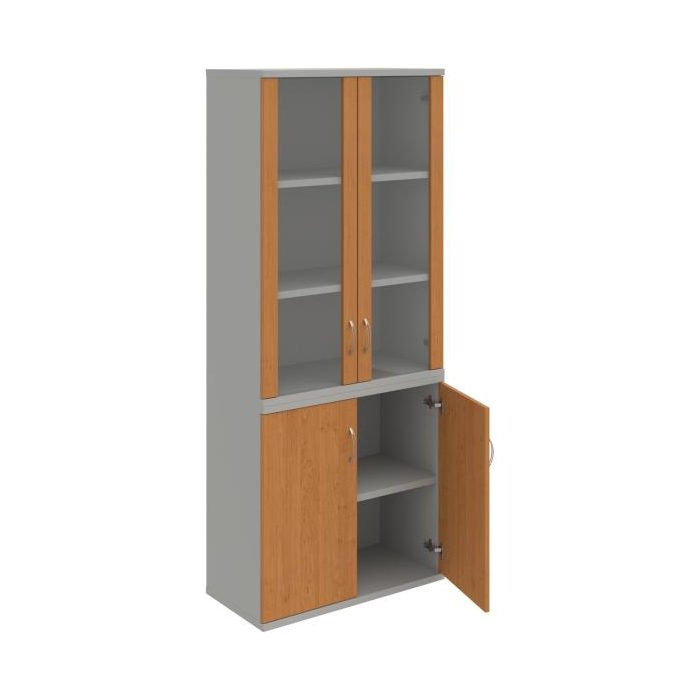Kombinovaná skriňa - dvere/nika. Kancelárske skrine STRONG majú robustnú konštrukciu a vyššiu nosnosť políc ako bežné kancelárske skrine.V ponuke sú skriňové moduly s výškou 185 cm, 111 cm alebo 74 cm a šírky 80 cm alebo 40 cm. Hĺbka všetkých modelov skriňového radu STRONG je 40 cm.Chrbát, vyrobený z 8 mm hrubých dosák, je obojstranne pohľadový, takže skrine môžete použiť ako priestorový deliaci prvok. Hrúbka samotných políc je 25 mm, čo znamená nosnosť 80 kg na 1 policu.Korpusy, dvierka a police skríň sú olepené odolnou 2mm ABS hranou, ktorá garantuje dostatočnú ochranu proti poškodeniu.
