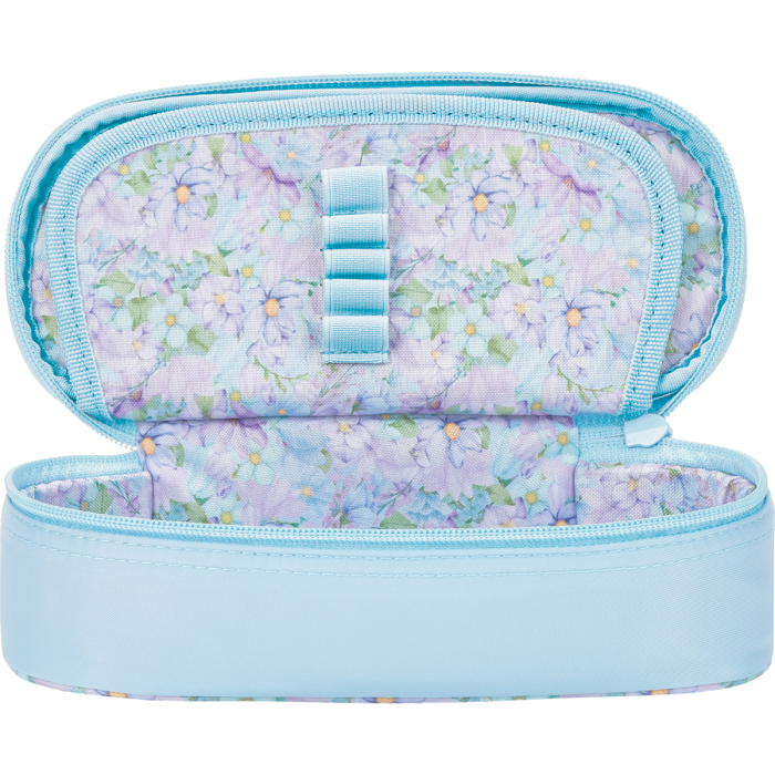 Vodeodolná polyesterová tkanina, kvetinová podšívka vo vnútri puzdra. Klopa s integrovaným vreckom a pútkami na pero. Hlavné vrecko na zips. Rozmery 23,5 x 8,5 x 5 cm.