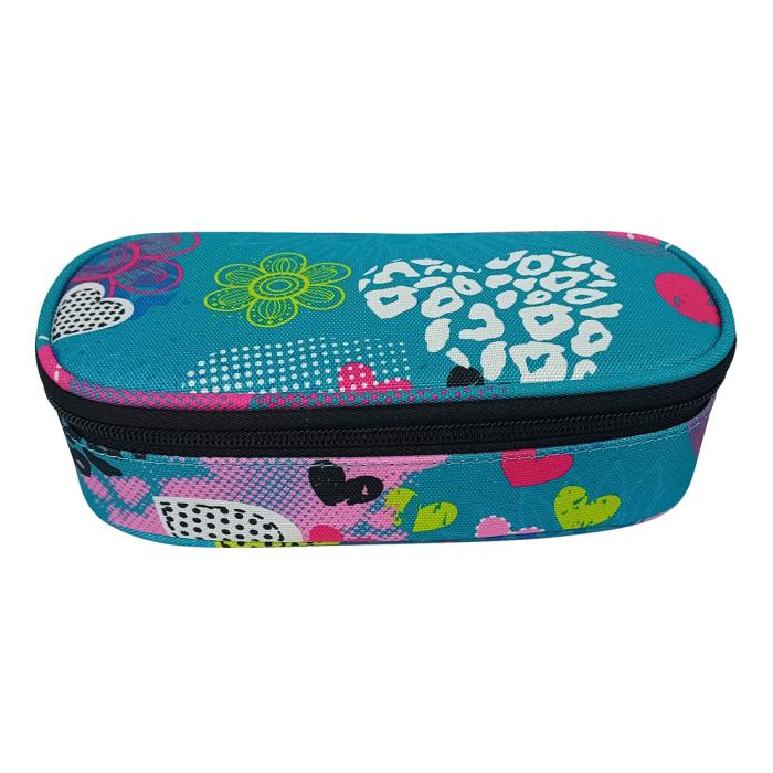 Oválny peračník na zips, 1 vnútorná chlopňa s pútkami na pero, bez náplne, materiál polyester. Rozmery: Š x V x H: 21 x 5,5 x 10,5 cm. Motív Srdce a Kvety.