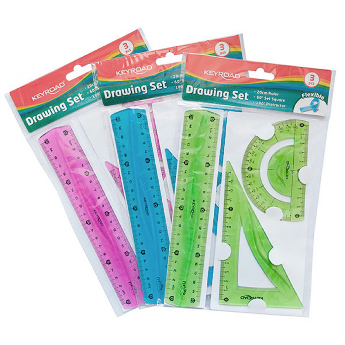 Sada geometrických pomôcok užitočná pre každého študenta. Ohybná, s mierkou podľa noriem. Stredná sada: pravítko 20 cm, uhlomer 10 cm, trojuholník 14 cm. Farba: mix farieb.
