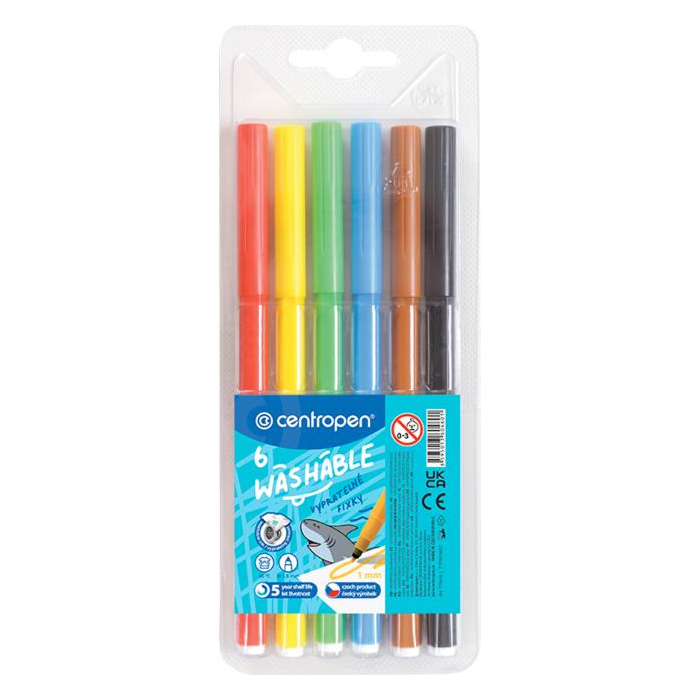 Popisovač vyrobený z PP s ventilačným bezpečnostným uzáverom a vláknovým hrotom odolným voči zatlačeniu. Šírka stopy 1,8 mm. Dodávaný v sade 6 farieb. Farba: sada 6 ks Typ hrotu: vláknový Šírka stopy: 1,8 mm