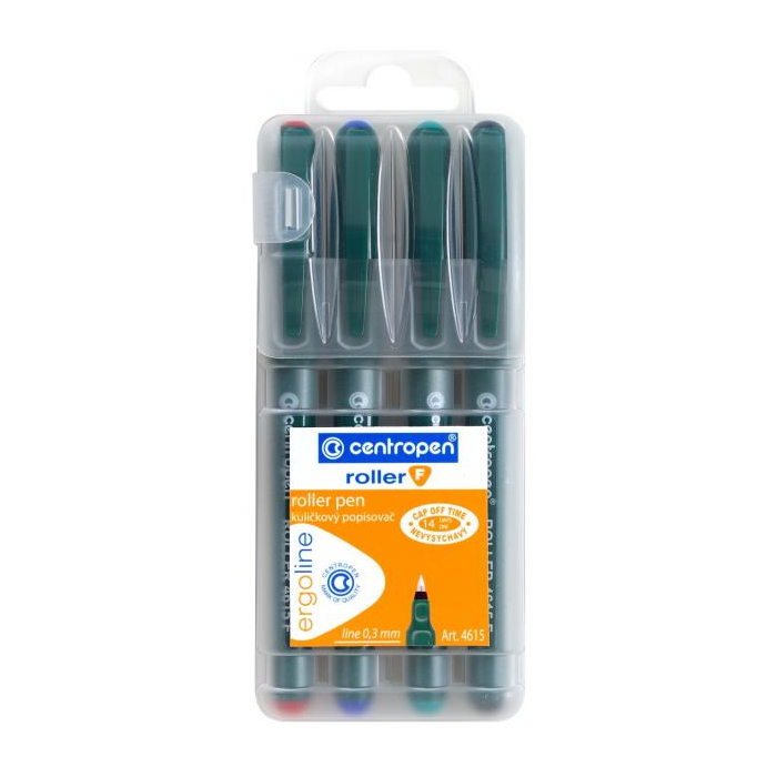 Sada 4 rollerov v základných farbách náplne a novom ergonomickom dizajne s jemným kovovým hrotom s guľôčkou z karbidu wolfrámu a nevysychajúcim atramentom (vydrží 14 dní bez vrchnáka). Šírka stopy 0,3 mm, dĺžka stopy 2200 m.