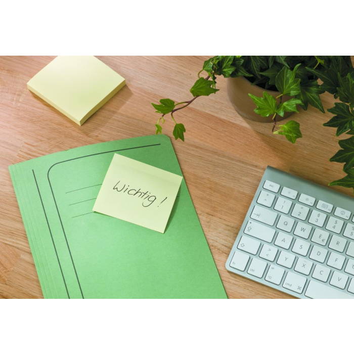 Ekonomický a ekologický zásobník so 6 bločkami v žltej farbe. 100% recyklované papierové vlákna a obal. Lístky sú vyrobené z certifikovaných papierových vlákien Blue Angel. Minimálne použitie obalového materiálu. Obal je zaručene nebielený a nefarbený. Rozmery 76 × 76 mm. Počet lístkov 6 x 100.