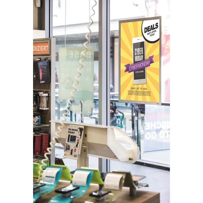 Antistatický informačný panel na prichytenie oznamov na vonkajšie sklá, ktorý sa lepí z vnútornej strany. S ochranou voči UV žiareniu. Odoláva teplotám až do 70 °C. Informácie sa ľahko vymieňajú vďaka magnetickému rámu a sú čitateľné z oboch strán. V prípade potreby je ľahko premiestniteľný. Farba strieborná. Formát 50x70 cm.