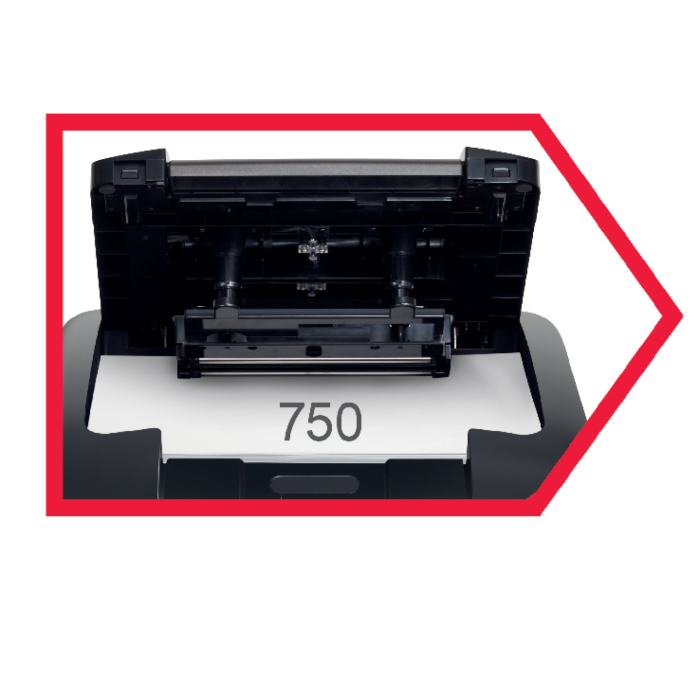 "Funkcia automatického podávania pre až 600 hárkov (80 g/m2) alebo manuálneho plnenia po 9 hárkoch A4 (80g/m2)
