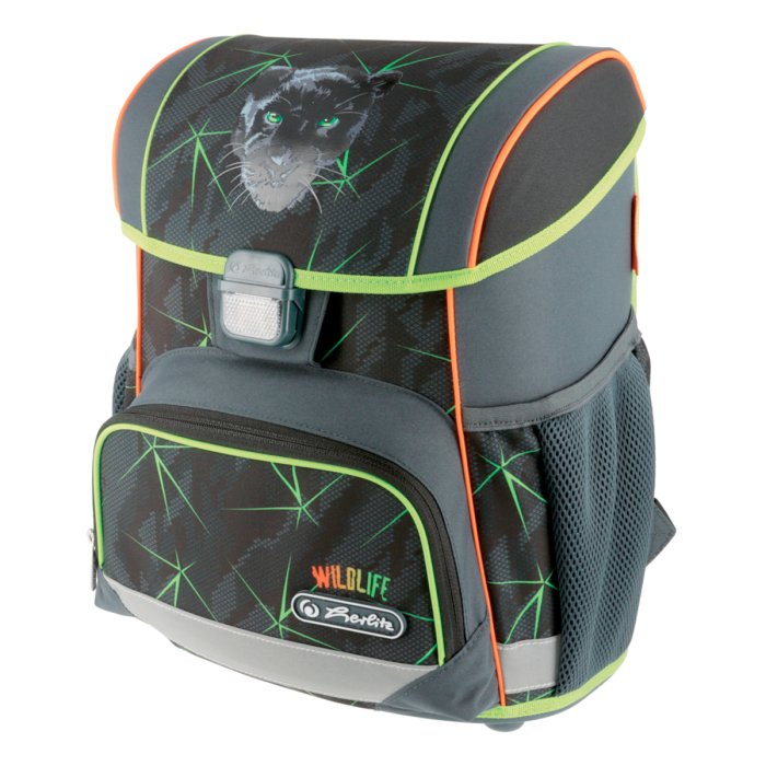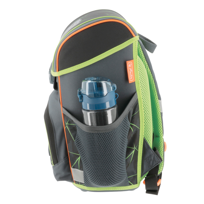 Školská taška s výbavou, ergonomicky tvarovaným a priedušným polstrovaním chrbta, nastaviteľnými ramennými popruhmi, výškovo nastaviteľným hrudným pásom, hlavným vreckom s priestorom na knihy, bočnými vreckami s elastickými pásikmi, predným vreckom na zips, stabilnou spodnou doskou s nožičkami, pohodlnou rukoväťou a reflexnými prvkami Oralite. Hmotnosť 950 g, objem 16 l, rozmery 37 x 31 x 22 cm. Vode-odolná, bez PVC, výbava: peračník, vrecko na prezuvky, okrúhle puzdro. Certifikát ergonómie 2023 a 2025. Materiál: polyester.