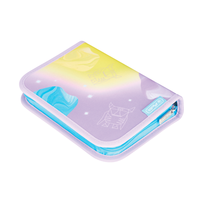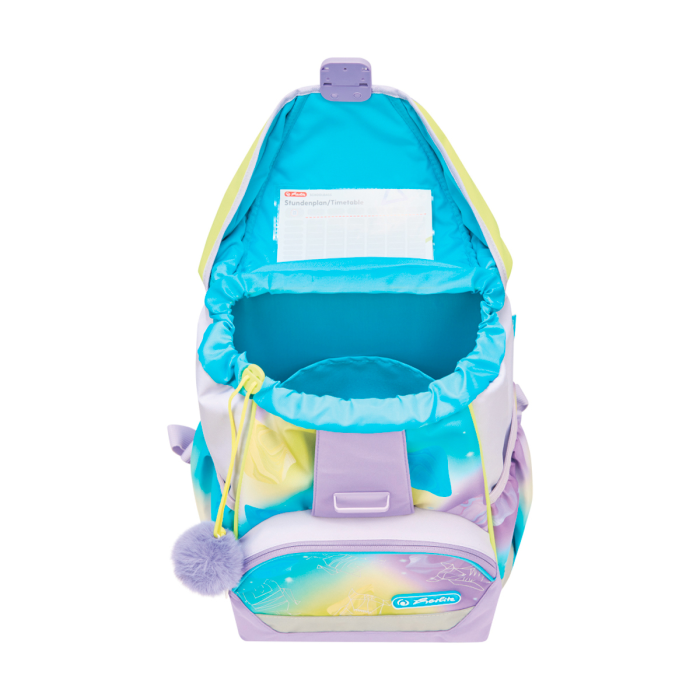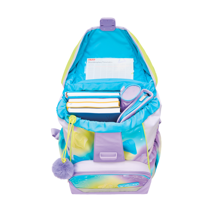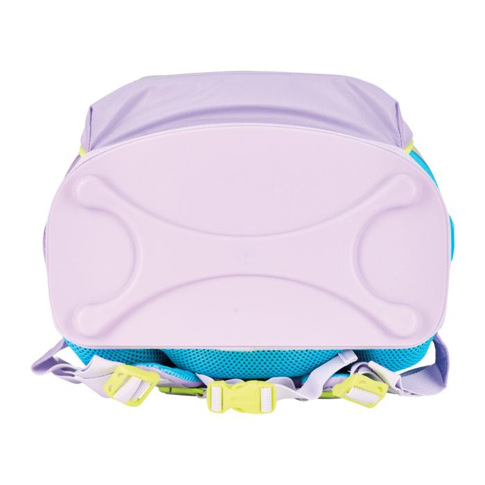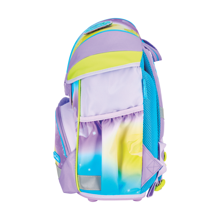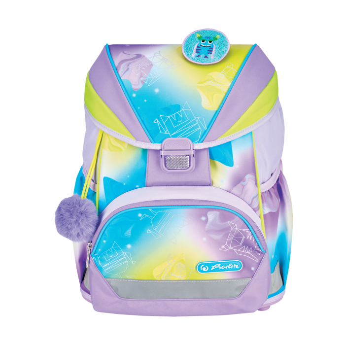 Školská taška s výbavou, s anatomicky tvarovaným polstrovaným a priedušným chrbtom, nastaviteľnými ramennými popruhmi, predným vreckom na zips, dvomi bočnými vreckami s elastickými pásikmi, stabilnou spodná doskou s nožičkami, pohodlnou rukoväťou, reflexnými prvkami Oralite, zatváranie Click lock zips, 1 x odnímateľný odznačik na suchý zips, 1 x dekoratívny prvok. Hmotnosť 800 g, objem 22 l, rozmery: 39 x 32 x 25 cm. Vode-odolná, bez PVC, výbava: peračník prázdny 2 chlopne, vrecko na prezuvky, oválne puzdro.