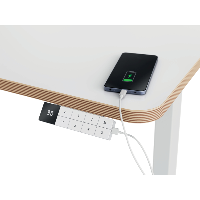 • Ovládací panel s detskou poistkou, nabíjacími portmi USB-C a USB-A, digitálnym displejom výšky, dôvtipnými pripomenutiami vstávania, ochranou proti prehriatiu a funkciou proti kolízii.