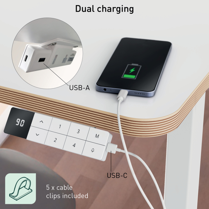 • Ovládací panel s detskou poistkou, nabíjacími portmi USB-C a USB-A, digitálnym displejom výšky, dôvtipnými pripomenutiami vstávania, ochranou proti prehriatiu a funkciou proti kolízii.