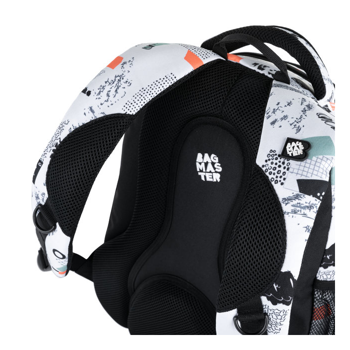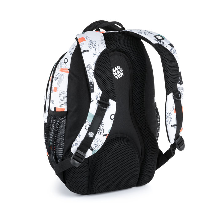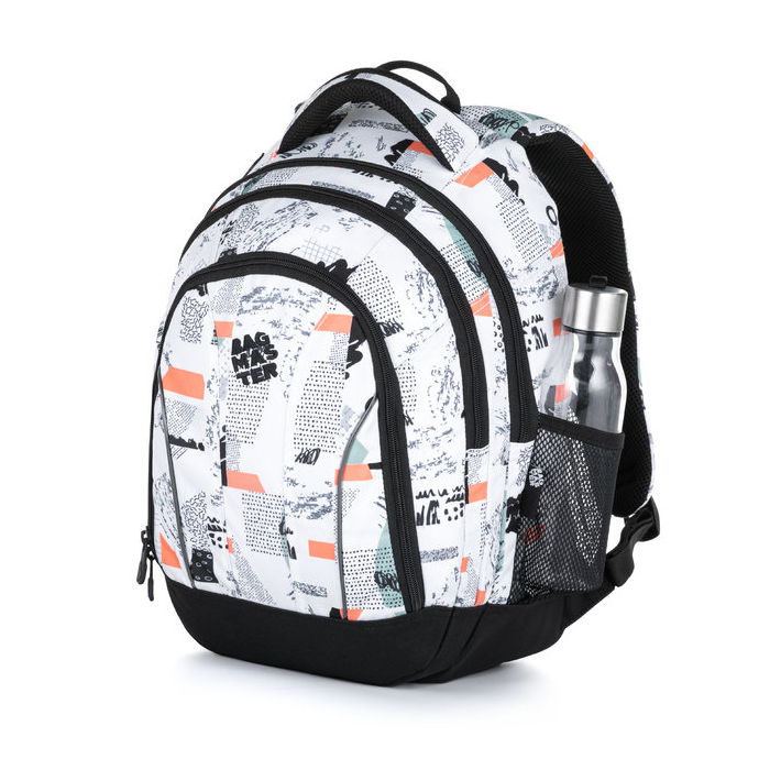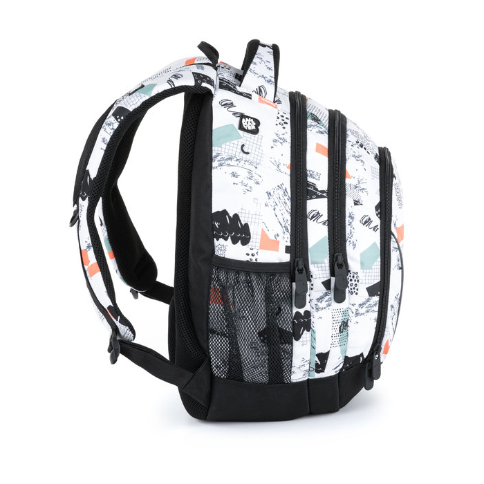 Hlavná komora je veľmi priestorná, pohodlne sa do nej vojdu napr. školské dosky aj učebnice formátu A4. Vo vnútri komory je veľké vrecko na gumu. Druhá (prostredná) komora je vhodná na formát A4. V prednej komore je prehľadný organizér, zo sieťovaným vreckom na zips. V prednej časti batohu je vrecko na zips, jeho vnútorná hĺbka je 23 cm! (kopíruje veľkosť prednej komory). Dve bočné sieťované vrecká, vhodné na fľašu. Dno batohu je z vonkajšej strany z látky 600 D polyester, vnútorná časť je vystužená podšívkou. Ramenné popruhy sú anatomicky tvarované a mäkko vystužené. Batoh je možné fixovať na ramenách pomocou voliteľného príslušenstva flexibilnej hrudnej pásky, ktorá nieje súčasťou ale môžete si ju u nás k batohu dokúpiť. Materiály splňujú, z hľadiska nezávadnosti, normy EU. Dno batohu je vystužené a prešité.