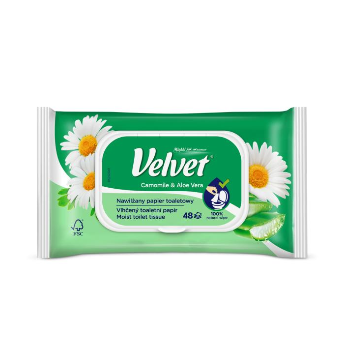 Vlhčený toaletný papier s jemnou kamilkovou vôňou určený k dennej hygiene po použití toalety. Je rozložiteľný, splachovateľný.