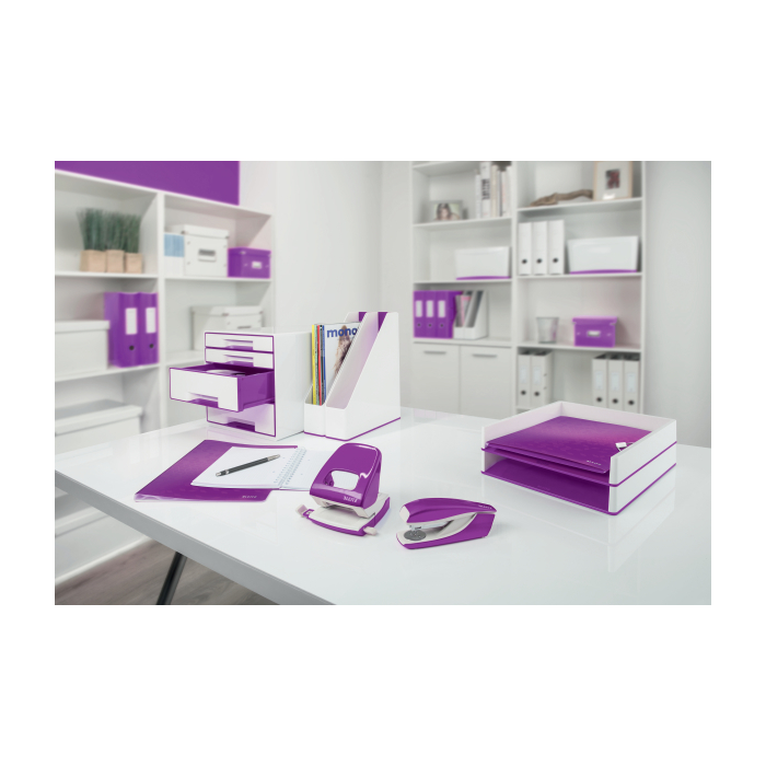 Dodajte svojmu pracovnému miestu alebo domácnosti farbu a skombinujte s ostatnými kancelárskymi výrobkami z radu Leitz WOW. Na spinky Leitz Power Performance P3, 24/6 a 26/6. Vrátane štartovacieho balenia. Praktický integrovaný vyberač spiniek. Farba purpurová.