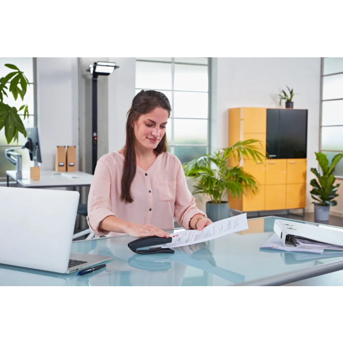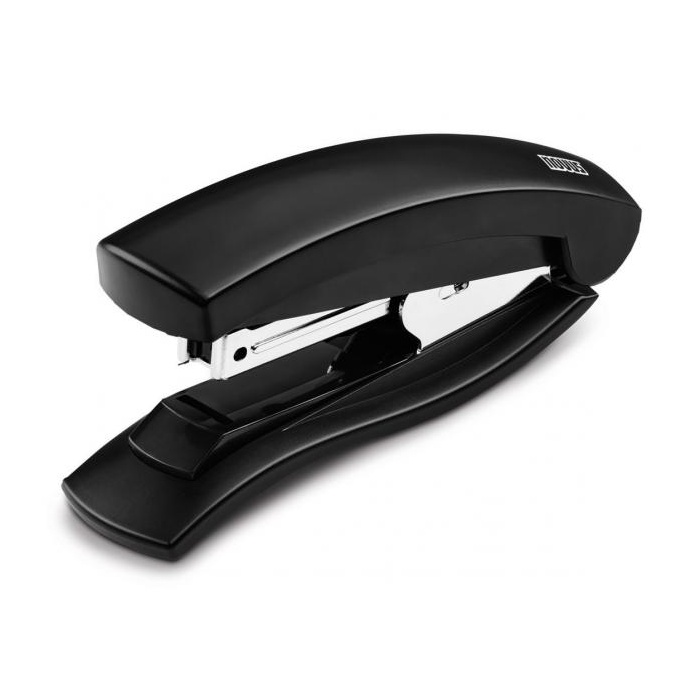Celokovová kancelárska zošívačka s plastovým vrchným dielom a jednoduchým vedením spiniek a s vlastnosťou plochého zošívania. Kapacita náplne 100 spiniek 24/ 6 alebo 150 spiniek 26/ 6. Zošívanie so zníženým úsilím. Hĺbka zošívania 6 cm. Hmotnosť 245 g. Záruka 5 rokov. Kapacita zošívania 30 listov. Farba čierna.